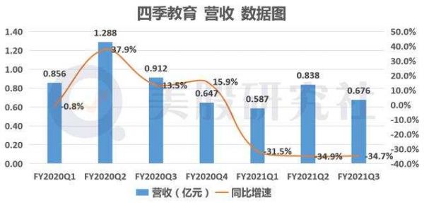 财报显示,四季教育2021财年Q3的营收为0.676亿元,同比减少34.69%,环比减少19.33%。回顾过去的业绩,四季教育在2018至2020财年分别取得3.01、3.36、3.89亿元的营收规模。