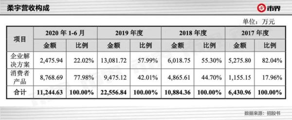 招股书显示,在2020年之前,柔宇主营产品为“企业解决方案”。在2017年,柔宇的“企业解决方案”销售额5275.8万元,营收占比82.04%。2019年,这部分产品销售金额为1.31亿,在公司整体营收占比降低至57.99%。