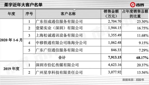 比较2020年上半年与2019年的前五大客户,只有壹梁实业(深圳)有限公司仍然在列。深圳市伯亿传媒有限公司是柔宇在2019年的第一大客户,相关销售金额达到4623.16万元,占当年柔宇年度销售总额的比例达到20.37%,到2020年上半年,却从大客户列表消失了。