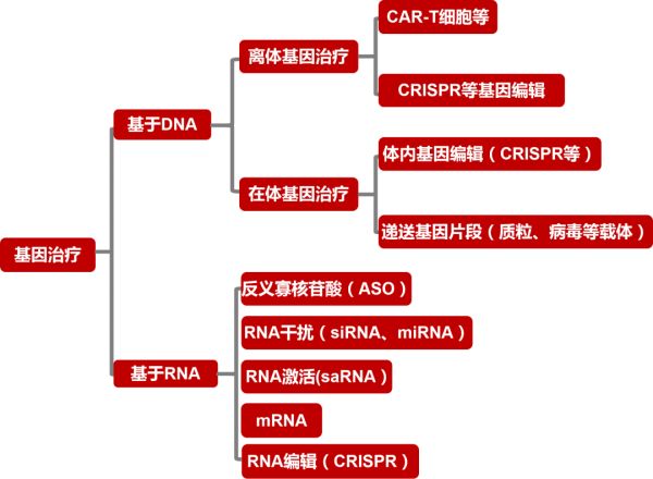 整个基因治疗产业经过多年的发展至今,已经与最初的定义有所不同,逐步形成了多个细分领域(例如,根据基因修饰层面不同可以分为基于DNA的基因治疗和基于RNA的基因治疗),并且涌现了多层次的代表产品。