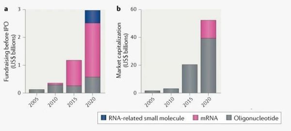 ▲私人RNA治疗公司的融资(a)上市RNA治疗公司的市值(b)