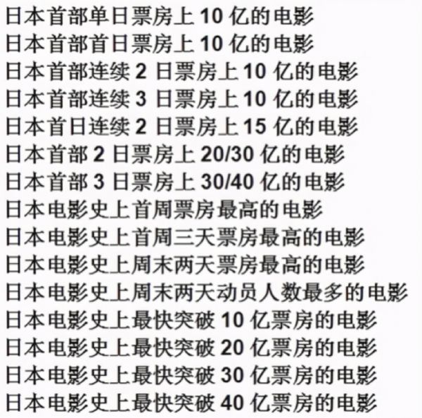 票房在疫情横行的2020年超越《千与千寻》问鼎日本影史第一、总票房超过350亿日元(21亿人民币)、连续12周成为日本周票房冠军……