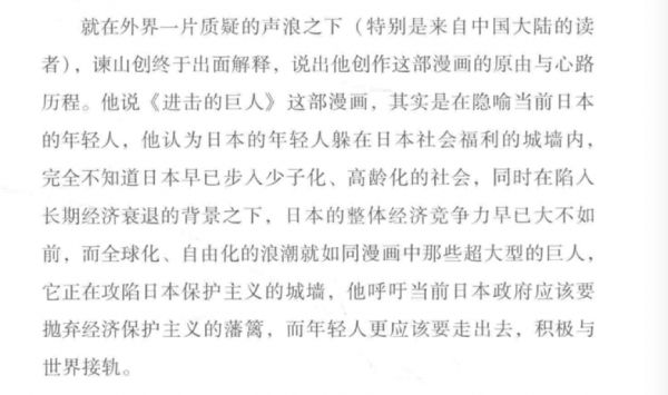 值得一提的是,谏山创曾经表示,《进击的巨人》本身其实是隐含了对于日本年轻人的批判、警示,围墙内的世界正是长期经济衰退背景下的日本。然而这种警示本身没有得到广泛讨论,反倒是反英雄设定和悲情的故事引发了喜爱丧文化的人们的共鸣,多少有些讽刺的意味。