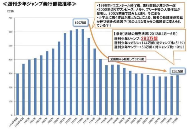 由于《龙珠》《灌篮高手》等热门作品的故事相继在1994-1995年进入白热化,《JUMP》1995年的发售量达到了历史顶点的653万册。但伴随着这两部漫画在1995年与1996年先后完结,《JUMP》的发行量在1997年骤降至400万册,并且自此再也没能重返当年的辉煌。
