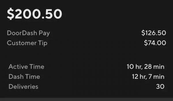 另外一位送餐员则晒出了自己的工资单。这一天他在线12个小时,送餐时间10个半小时,送了30单外卖,收到了DoorDash的126.5美元送餐费,加上74美元的小费。全天收入合计200.5美元。虽然看起来收入还不错,但考虑到纽约市最低工资是15美元,工作10个半小时,也应该有160美元,而且送餐员还需要自付油费、车辆折旧、医疗保险等诸多成本。