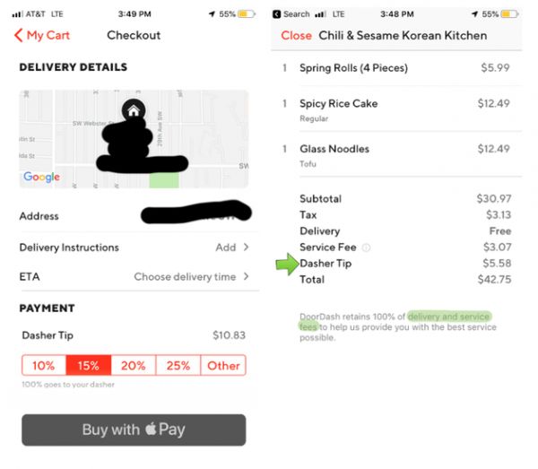 这种基本薪酬加小费的模式也被共享经济模式的其他企业所普遍采用。无论是共享乘车司机,还是外卖送餐员,或者是生鲜电商送货,都需要消费者在运费之外额外再加一笔司机小费。而且,外卖平台是根据餐费比例来给小费的。近期DoorDash订餐还需要再加一笔1.5美元的监管部门政策调整费(Regulatroy Response Fee),这是他们因为加州政府限制外卖平台对餐馆的手续费而导致的收入减少部分。