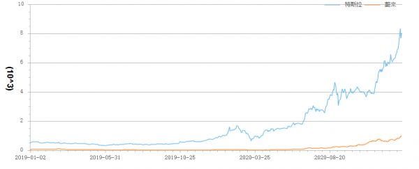 特斯拉和蔚来市值 数据来源 / 东方财富Choice