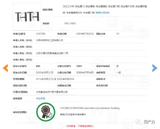 例如,苏州博士隆名下使用在第9类“电铃按钮、电门铃、防盗报警器、警笛”商品上的第11864197号“TATA”注册商标,和使用在第7类“厨房用电动机器、制食品用电动机械、磨革机、犁”商品上的第26932314号“TATA”注册商标,也分别遭到北京闼闼同创的无效宣告申请。