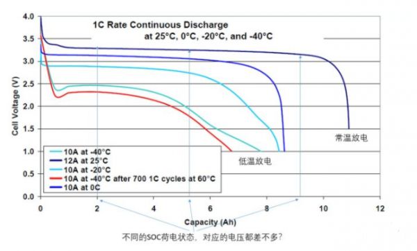 典型磷酸铁锂放电曲线:低温下性能明显降低