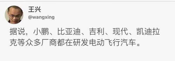 之后,美团CEO王兴点评道:“据说,小鹏、比亚迪、吉利、现代、凯迪拉克等众多厂商都在研发电动飞行汽车。”