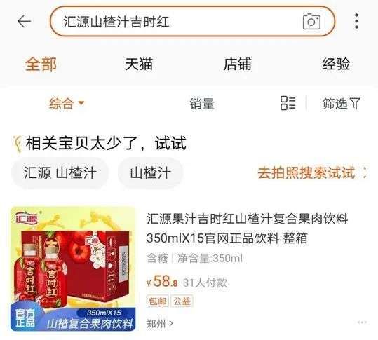 2019年,汇源“山楂吉时红产品”荣获“2018中国食品行业最佳创新产品奖”,主打60%果汁含量,然而在淘宝上输入该名称却显示 “相关宝贝太少”。