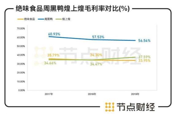但万事都有两面性,这种模式也带来了负面影响——毛利率碰到天花板。2017-2019年,绝味食品的毛利率分别为35.79%、34.3%、33.95%,逐年下滑。在卤味市场,这些数据并不乐观。Wind数据显示,2017-2020年上半年,周黑鸭的销售毛利率分别为60.93%、57.53%、56.54%和54.56%;煌上煌的销售毛利率分别为34.66%、34.47%、37.59%和35.62%,均高于绝味食品。