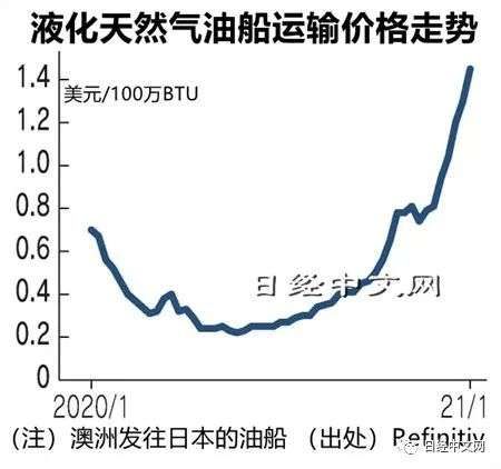 液化天然气不足的背景是袭击东亚的历史性霸王级寒潮。“新运输船一招标,率先实现经济恢复的中国及正从煤炭发电转换成液化天然气发电的韩国也来投标”(三菱商事)。由于局部需求扩大,液化天然气的亚洲现货价格截至1月中旬每100万BTU(英国热量单位)超过30美元,上涨到1个月前的大约3倍。