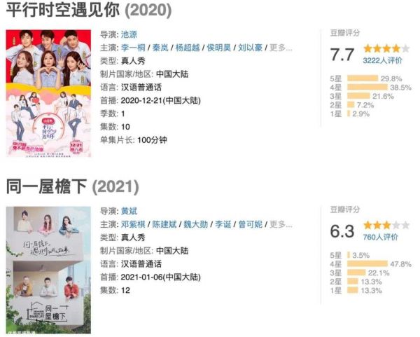 而优酷的《同一屋檐下》在上线仅两周后相对热度较低,豆瓣打分6.3,播出情况更不乐观。