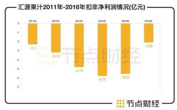 年报数据显示,2011年-2016年,汇源果汁的营业收入从38.26亿元增长至57.41亿元,但每年的扣非净利润却逐步恶化,分别为-2.3亿元、-3.18亿元、-4.79亿元、-5.75亿元、-5.53亿元、-2.08亿元,六年间主营业务累计亏损高达23.63亿元。