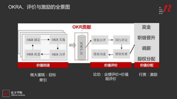 在这里面大家可能会纠结OKR和考核、KPI到底什么关系,我觉得根本就不应该混淆在一起。OKR是解决什么问题的?解决价值创造、怎么把目标做大。然后才是价值的评价。KPI是评价的标准,决定你的级别、决定你的收入水平。这完全是两码事。基于OKR有效的产出,然后再做评价,然后再做决定,这叫论功行赏,决定你价值分配、晋级、调薪、职权等。另外强调一下,绩效评价一定不能只根据财务结果,还要根据员工的表现、价值观和团队协作等。