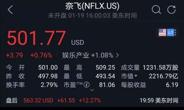 奈飞订阅用户规模增长远超预期和现金流前景提振,推动奈飞股价在盘后交易中大涨12.27%,报563.32美元。