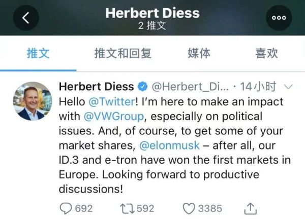大众集团CEO赫伯特·迪斯近日加入推特,首条推文毫不掩饰地指向马斯克。他在推文中写道:“我来这里是为了让大众集团产生影响,尤其是在政治问题上。当然,也是为了夺取你的一些市场份额,@埃隆马斯克。”