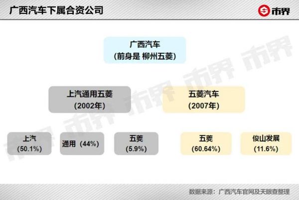 2002年,上汽通用五菱合资公司成立,公司注册地址在广西柳州,上汽、通用、五菱(即2015年组建的广西汽车集团有限公司,前身是柳州五菱汽车有限责任公司)三者的持股比例分别是50.1%、34%和15.9%。