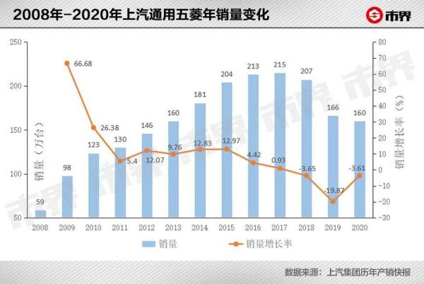 整体销量上,之前一直保持增长的上汽通用五菱,也自2018年开始出现销量下滑。2018年、2019年,上汽通用五菱销量分别同比下滑3.65%、19.62%,其中2019年销量由上一年的206万辆跌至166万辆。