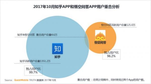 2017年底,在QuestMobile发布《百科问答APP洞察报告》中显示,知乎是典型的二高人群:高知、高收、年轻;悟空问答则只占了一高:高龄,其他特点则是低知、低收。两者重合用户不到5万,用户画像表现出明显的独占特征。