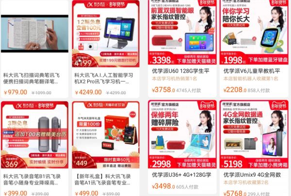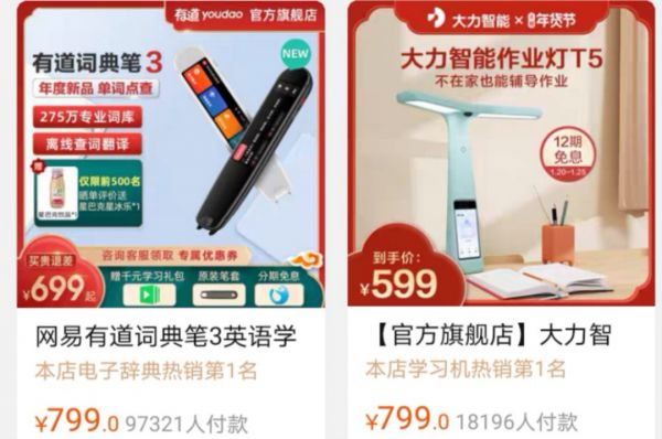 各家天猫旗舰店数据显示,截止1月20日,有道词典笔3近10万人付款;大力智能作业灯T5超1万7千人付款;科大讯飞扫描词典笔和AI人工智能学习机均超过7000人付款,其他错题打印机如喵喵机价格较低销量过50万。