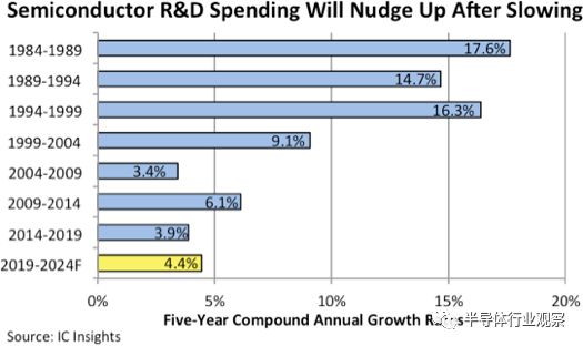 本周,IC Insights给出的预测数据显示,2021年至2025年,全球半导体芯片厂商的总研发支出将以5.8%的复合年增长率(CAGR)增长。