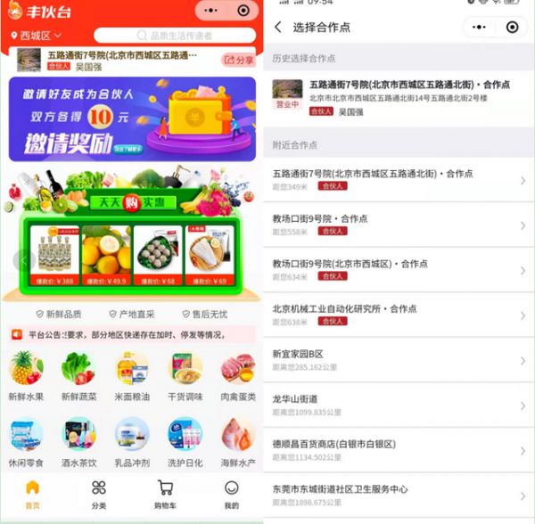进入“丰伙台”的微信商城就可以清晰地看到界面上有很多购物的优惠活动,并且进入时候,首先会让消费者选择一个“合作点”,点击进入合作点界面后,消费者就可以发现其所在区域周边的服务“合作点”以及“合伙人”。