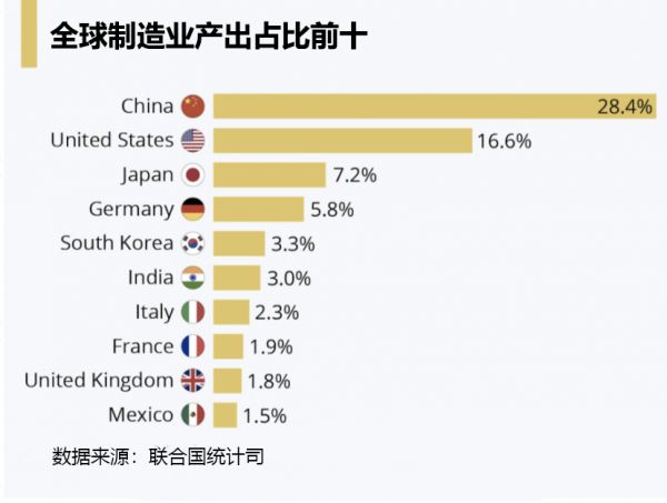 在数据上,这个观点也并非没有例证,联合国统计司数据显示:2018年全年,中国占全球制造业产出的28%,比美国领先了10个百分点。
