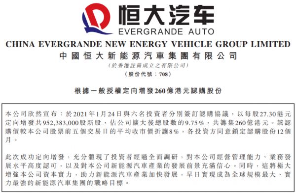 1月24日晚间,恒大汽车发布公告称,已与六名投资者分别签订认购协议,以每股27.30港元定向增发共计约9.52亿股新股,占公司扩大后总股数的9.75%,共筹集260亿港元。该认购价较恒大汽车股票前五个交易日的平均收市价折让8%,各投资方同意锁定认购股份12个月。