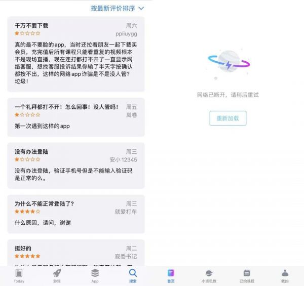 ■ App Store的TT直播健身用户评论(左),TT直播健身APP已无法登陆(右)