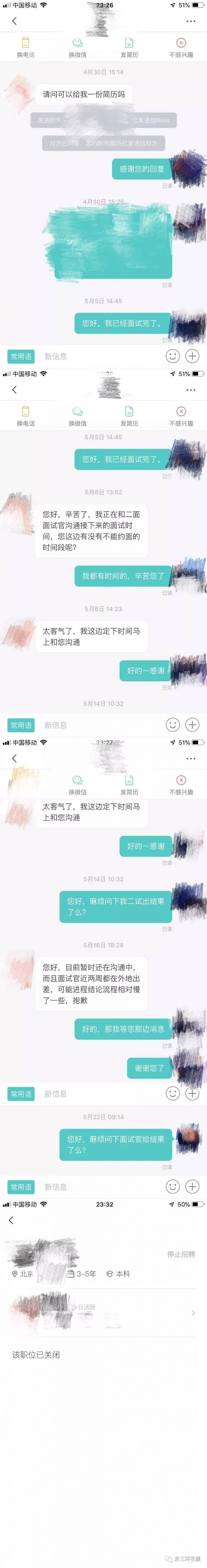 还有一次业务线负责人上来就问我:要是公司里90后公开顶撞你,你怎么办?我说那就先沟通啊,看看是什么问题。我觉得我回答的都没什么问题,那次面试和业务负责人先聊了一个小时,之后又和HR聊了一个小时,让我回去等通知。等我一周之后问反馈的时候就让我等,最近我再去看那个职位已经关闭了。
