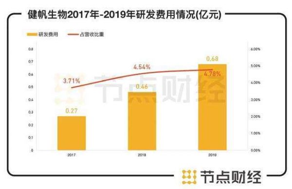 在2017年、2018年和2019年,在健帆生物销售费用约占三成营业收入的比重时。同期研发费用仅为2663万元、4614万元和6845万元,占营业收入的比重分别为3.71%、4.54%、4.78%。