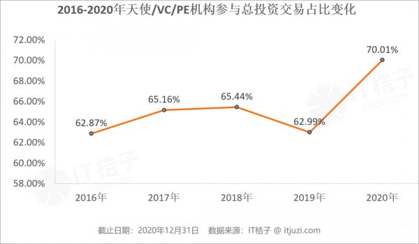 2020 年,中国一级市场中,超过 70% 的投资事件背后有天使、VC、PE 机构的身影。投资机构的主体地位越发明显,股权投资机构于创业市场发展的作用越来越明显。