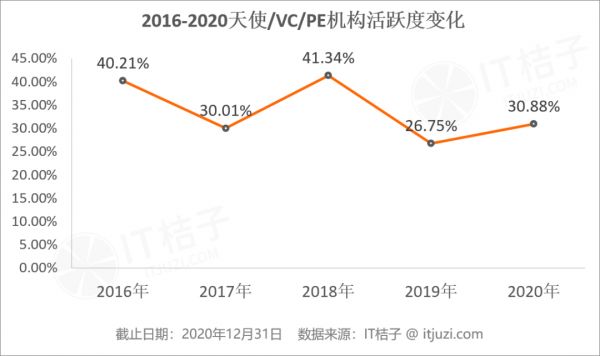根据 IT 桔子数据,2016-2020 年间,天使/VC/PE 历年综合平均活跃度为 33.84%,即市场中每年仅有约合 1/3 的天使/VC/PE 机构在实际参与一级市场投资。