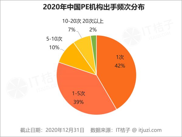 IT 桔子数据显示,2020 年中国 PE 机构中仅有不足 2% 的机构参与了超过 20 次以上的投资,81% 的 PE 机构投资频次在 5 次及以下。
