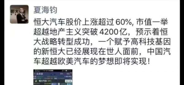 对此,恒大总裁夏海钧发朋友圈,豪言称:恒大汽车市值4200亿,超过地产主义(业),预示着恒大转型成功,一个赋予高科技基因的新恒大展现在世人面前,中国汽车超越欧美梦想即将实现!