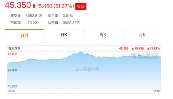 这是新能源汽车行业最大规模的股权融资之一。受此影响,1月25日恒大汽车开盘大涨,一度涨幅高达60%,市值超过4200亿元(最终收盘涨幅为51.67%,总市值3998亿港元)。