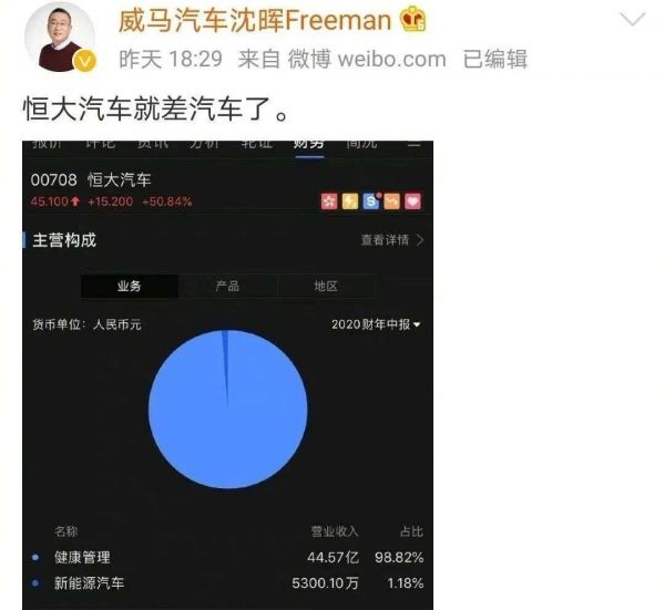 梦想确实足够宏大。“恒大汽车,就只差汽车了。”1月26日,威马汽车创始人沈晖在微博发了个恒大汽车2020年中财报图片后,如此评价。