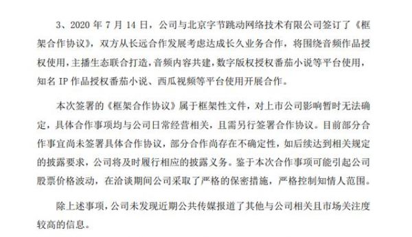 早在2020年7月份,中文在线与字节跳动签订《框架合作协议》,合作的主要内容是围绕音频作品授权使用,主播生态联合打造,音频内容共建,数字版权授权番茄小说等平台使用,知名IP作品授权番茄小说、西瓜视频等平台使用开展合作。
