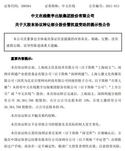 就在昨天(1月25日)中文在线发布公告称,腾讯旗下产业基金深圳利通、阅文和百度七猫分别投入3亿元,总计9亿元的价格获得中文在线15%的股权,由于腾讯和阅文是一家,因此腾讯系成为中文在线持股10%的第二大股东,持股比例仅次于中文在线创始人、实控人童之磊。