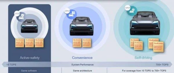 Snapdragon Ride自动驾驶平台同样分为三个等级,入门级的产品使用单SoC支持NCAP标准的L1和L2级别的自动驾驶,功耗小于5W,算力可以达到10TOPS。