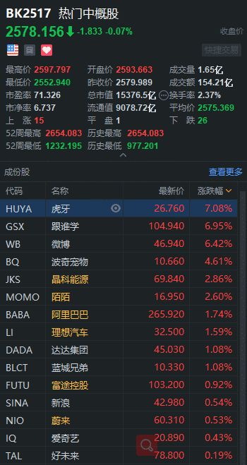 知名中概股中:阿里巴巴涨1.74%;百度跌2.58%;京东跌1.43%;网易跌1.9%;微博涨6.42%;拼多多跌3.57%;蔚来涨0.53%;小鹏汽车跌1.19%;理想汽车涨1.59%;哔哩哔哩跌6.16%。