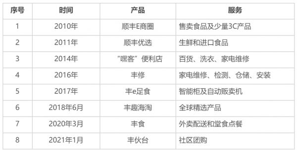 但快递和电商,又有很多部分是重合的。也正是基于这种业务上的重合,所以顺丰在快递本身的业务到了一定的体量后,一直没有停止对于自身边界扩张的试探。十年来,我们统计,顺丰至少做了八次突围,不可谓不努力。