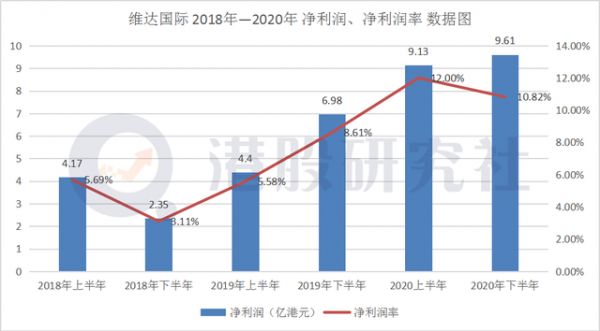 而从净利润的角度来看,2020年维达国际的净利润约18.74亿元,同比升64.7%;2020年下半年净利润9.61亿港元,净利润率为10.82%,同比增长37.68%;环比上半年的9.13亿港元也是略微提升。