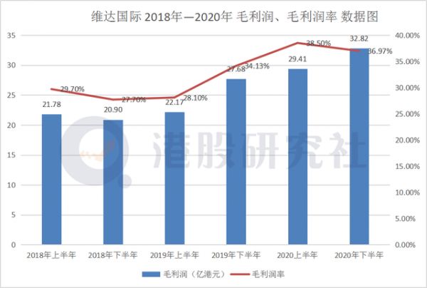 2020年下半年,其毛利达到32.82亿港元,同比增长18.57%,毛利率占总营收比重为36.97%。虽同上半年毛利率的38.50%略有下降。但与营收增长相似,毛利体量增速得以延续。