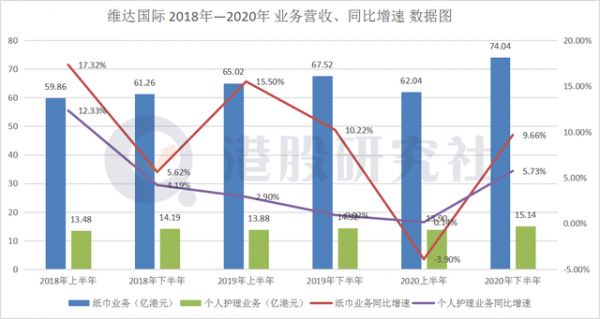 从维达国际的营收结构来看,2020年下半年,纸巾业务营收为74.04亿港元,个人护理业务营收为15.14亿港元。产品组合持续优化和较低的原材料成本以及疫情因素影响之下,消费者卫生意识加强,高端产品组合表现突出,是业务增长的主要原因。