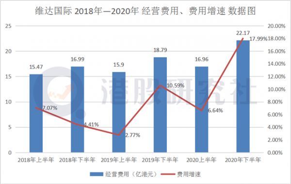 伴随着市场竞争的加剧,维达国际在品牌线上线下的推广以及销售渠道的拓展力度持续加大,短期内费用支出仍会呈上升趋势,财报数据显示,2020年全年经营费用为39.13亿港元,同比增长12.80%;而落实到2020年下半年,经营费用则有22.17亿港元,同比增长17.99%。