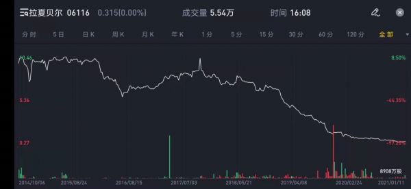 印象深刻的是拉夏贝尔,亏了90%多。总结了一下,首先是把运气当成实力。因为我当时操作过一次波司登,大概4毛港元的建仓成本,大概是3块左右卖掉。