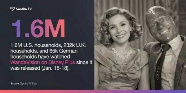 年后漫威宇宙的衍生剧集《旺达幻视》延续了这一势头。根据Samba TV预估数据,上线首周末约110万个家庭收看了《旺达幻视》,超出了去年星球大战衍生剧《曼达洛人2》首周末104万个家庭的数据。